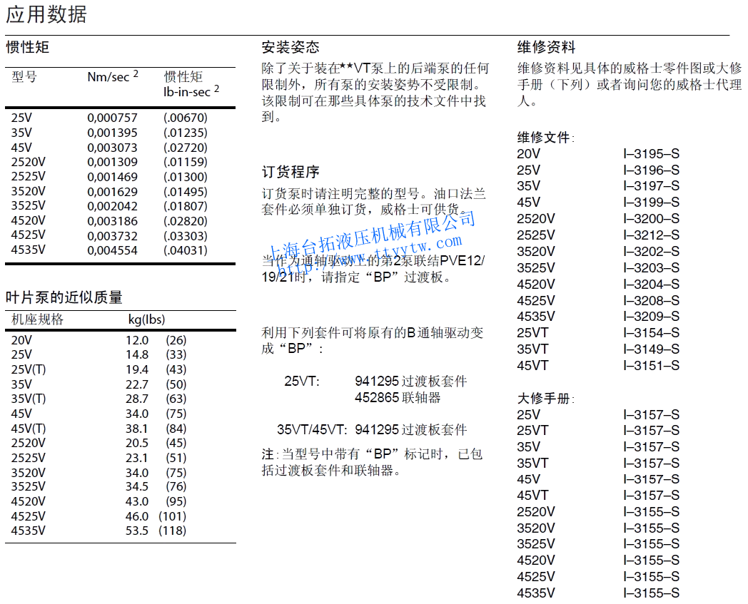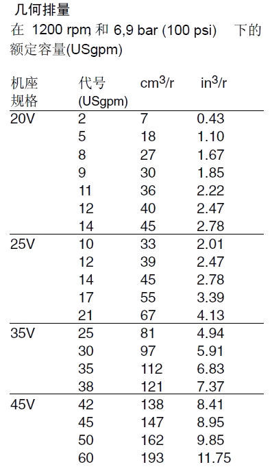 57,60,66,75備注:1、排量代號是在1200r/min和0.69Mpa(100psi)下的額定USgpm。2、對于上面所列以外的選擇,即安裝、排量、油口和軸伸請來電。3、轉速限制:a.最低轉速,所有型號和油液搭配600r/min。b.最高轉速:標準型號用抗磨液壓油1800r/min;標準型號用合成液和油包水乳化液1200r/min;用水乙二醇的型號1500r/min。