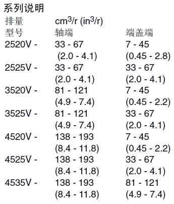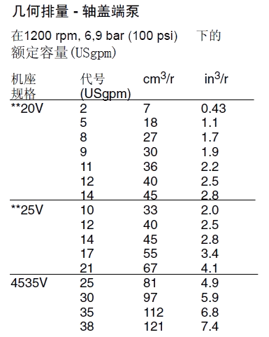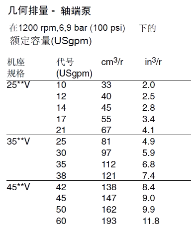 備注:1、排量代號是在1200r/min和0.69Mpa(100psi)下的額定USgpm。2、轉速限制:a.最低轉速,所有型號和油液搭配600r/min。b.最高轉速:標準型號用抗磨液壓油1800r/min;標準型號用合成液和油包水乳化液1200r/min;用水乙二醇的型號1500r/min。