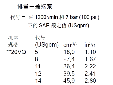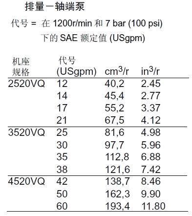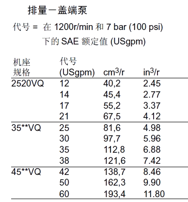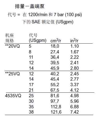 KW2520VQ 12 40.2 2700 210 88.5 41.0 5 18.0 2700 210 42.3 17.9 20.5 8 27.4 210 65.4 26.1 14 45.4 2700 103.8 46.6 11 36.4 210 88.5 35.4 17 55.2 2500 119.2 51.8 12 39.5 160 98.1 28.4 21 67.7 2500 146.2 61.9 14 45.9 140 115.4 29.1 3520VQ 25 81.6 2500 210 173.1 75.3 5 18.0 2500 210 38.5 16.5 34.0 8 27.4 210 61.5 24.0 30 97.7 2500 211.5 87.7 11 36.4 210 80.8 33.0 35 112.8 2400 230.8 98.5 12 39.5 160 90.4 26.1 38 121.6 2400 250.0 104.4 14 45.9 140 105.8 26.8 3525VQ 25 81.6 2500 210 173.1 75.3 12 40.2 2500 210 79.5 38.0 34.5 30 97.7 2500 211.5 87.7 14 45.4 210 91.0 43.0 35 112.8 2400 230.8 98.5 17 55.2 210 119.2 51.5 38 121.6 2400 250.0 104.4 21 67.5 210 146.2 61.9 4520VQ 42 138.7 2200 175 255.8 91.4 5 18.0 2200 210 32.0 14.5 43.0 8 27.4 210 51.0 21.0 50 162.3 2200 303.8 105.2 11 36.4 210 68.0 28.5 12 39.5 160 77.5 23.0 60 193.4 2200 369.2 126.8 14 45.9 140 91.0 24.0 4525VQ 42 138.7 2200 175 255.8 91.4 12 40.2 2200 210 68.0 33.0 46.0 14 45.4 210 79.5 38.0 50 162.3 2200 303.8 105.2 17 55.2 210 100.0 45.5 60 193.4 2200 369.2 126.8 21 67.5 210 125.0 54.5 4535VQ 42 138.7 2200 175 255.8 91.4 25 81.6 2200 210 145.5 66.5 53.6 30 97.7 210 178.0 77.5 50 162.3 2200 303.8 105.2 35 112.8 210 211.5 89.5 60 193.4 2200 369.2 126.8 38 121.6 210 223.0 97.0 備注:性能常數:SAE 10W油液@82℃(180華氏度),泵進口@0PSIG(14.7PSIA),出口壓力必須始終高于進口壓力。