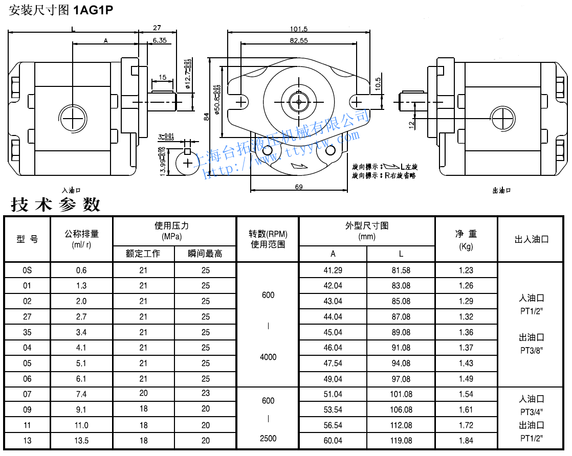 PT3/8"1AG1P01 1.3 42.04 83.08 1.26 1AG1P02 2.0 43.04 85.08 1.29 1AG1P27 2.7 44.04 87.08 1.32 1AG1P35 3.4 45.04 89.08 1.36 1AG1P04 4.1 46.04 91.08 1.37 1AG1P05 5.1 47.54 94.08 1.43 1AG1P06 5.1 49.04 97.08 1.49 1AG1P07 7.4 20 23 600-2500 51.04 101.08 1.54 入油口 PT3/4"