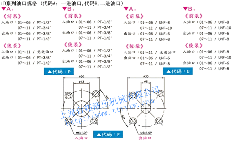 系列 型式/功能 前蓋法蘭規格 軸伸規格 進油口數 出入油口規格 前泵排量 后泵排量 旋向(R,L)