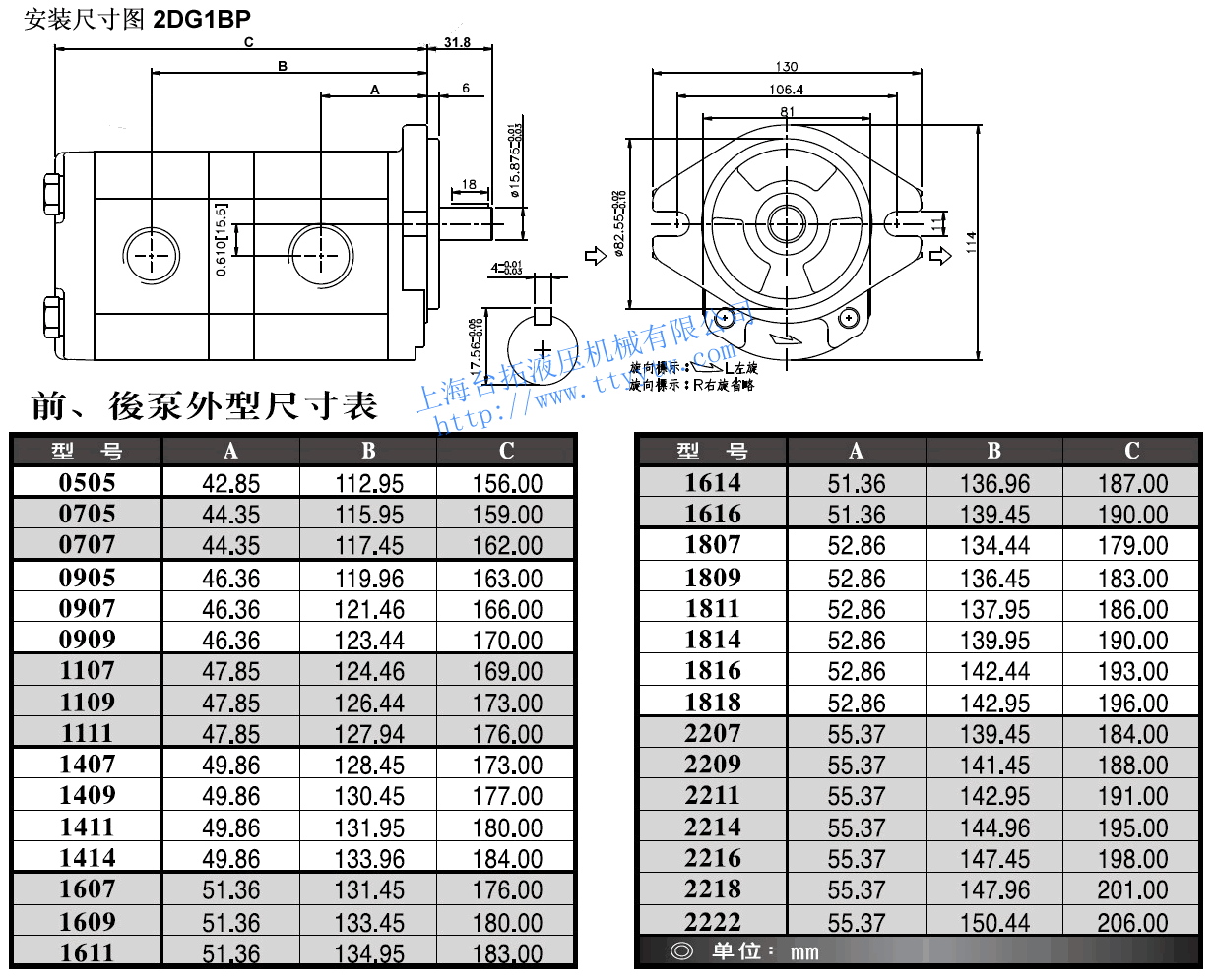 kg前泵 后泵 前泵 后泵 前泵 后泵 前泵 后泵L 2DG1BP0505 5.0 5.0 21 3500 PT1/2" PT1/2" PT3/4" 無(wú) PT3/4" PT3/4" 10.27 2DG1BP0705 7.0 5.0 10.44 2DG1BP0707 7.0 10.60 2DG1BP0905 9.5 5.0 10.58 2DG1BP0907 7.0 10.85 2DG1BP0909 9.5 11.06 2DG1BP1107 11.3 7.0 11.03 2DG1BP1109 9.5 11.24 2DG1BP1111 11.3 11.39 2DG1BP1407 14.0 7.0 11.23 2DG1BP1409 9.5 11.45 2DG1BP1411 11.3 11.60 2DG1BP1414 14.0 11.79 2DG1BP1607 16.0 7.0 PT 1" 11.44 2DG1BP1609 9.5 11.64 2DG1BP1611 11.3 11.80 2DG1BP1614 14.0 11.99 2DG1BP1616 16.0 12.16 2DG1BP1807 18.0 7.0 18 11.63 2DG1BP1809 9.5 11.84 2DG1BP1811 11.3 12.00 2DG1BP1814 14.0 12.18 2DG1BP1816 16.0 12.36 2DG1BP1818 18.0 12.56 2DG1BP2207 21.5 7.0 11.90 2DG1BP2209 9.5 12.11 2DG1BP2211 11.3 12.26 2DG1BP2214 14.0 12.45 2DG1BP2216 16.0 12.62 2DG1BP2218 18.0 12.84 2DG1BP2222 21.5 13.11 高壓雙聯(lián)齒輪泵2DG1BP尺寸圖