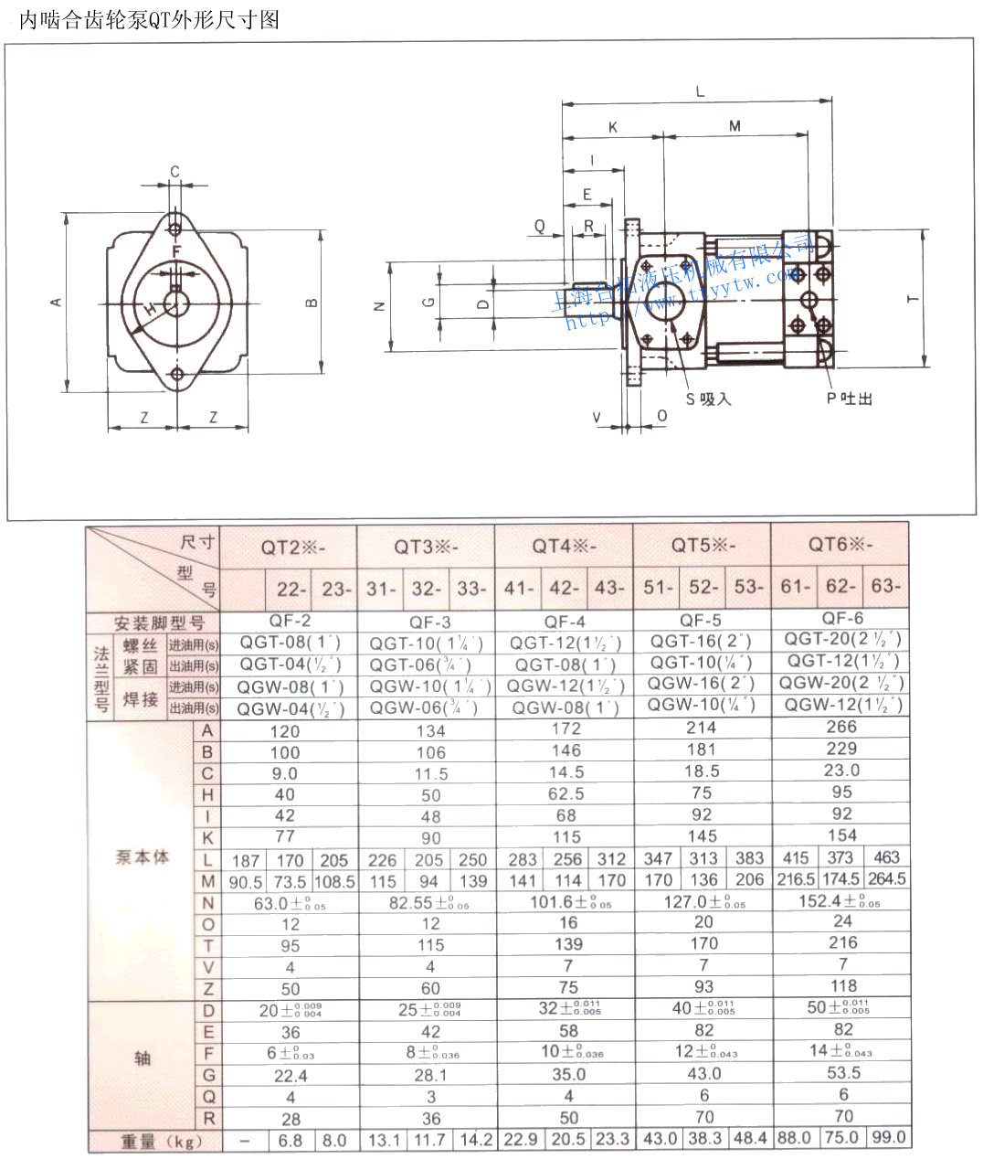 時的功率6P電機 4P電機 6P電機 4P電機 1200rpm 1800rpm 1000rpm 1500rpm QT22-4 140 160 1.7 - 7.5 - 6.4 QT22-5 2.0 6.5 9.8 5.4 8.2 QT22-6.3 2.4 7.9 11.9 6.5 9.9 QT22-8 3.0 9.8 14.8 8.2 12.3 QT32-10 3.8 11.9 17.9 9.9 14.9 QT32-12.5 4.8 15.0 22.6 12.5 18.8 QT32-16 5.9 18.6 28.0 15.5 23.3 QT42-20 7.6 24.1 36.3 20.0 30.2 QT42-25 9.4 29.9 45.0 24.8 37.4 QT42-31.5 12.1 38.5 57.9 32.0 48.2 QT52-40 14.6 45.7 70.3 38.9 58.5 QT52-50 18.7 60.3 90.6 50.2 75.5 QT52-63 23.4 75.9 114.0 63.2 95.0 QT62-80 29.4 95.6 143.7 79.6 119.7 QT62-100 36.9 120.3 181.2 100.4 150.9 QT62-125 45.4 149.0 223.8 124.1 186.4 備注1:本表用于大概的選擇QT泵型號,泵的詳細內容請再參照泵的性能表,還有表中的所需功率N(kw)是在1500rpm額定壓力時的值。