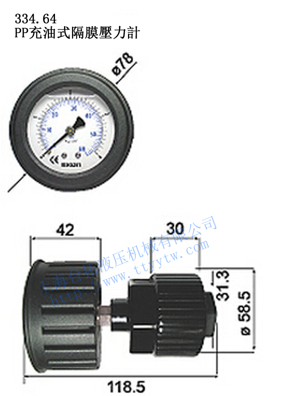 2、PP充油式隔膜壓力表334.64由于一體成型的構造,不易產生裂痕以及漏油現象,具抗腐蝕性。