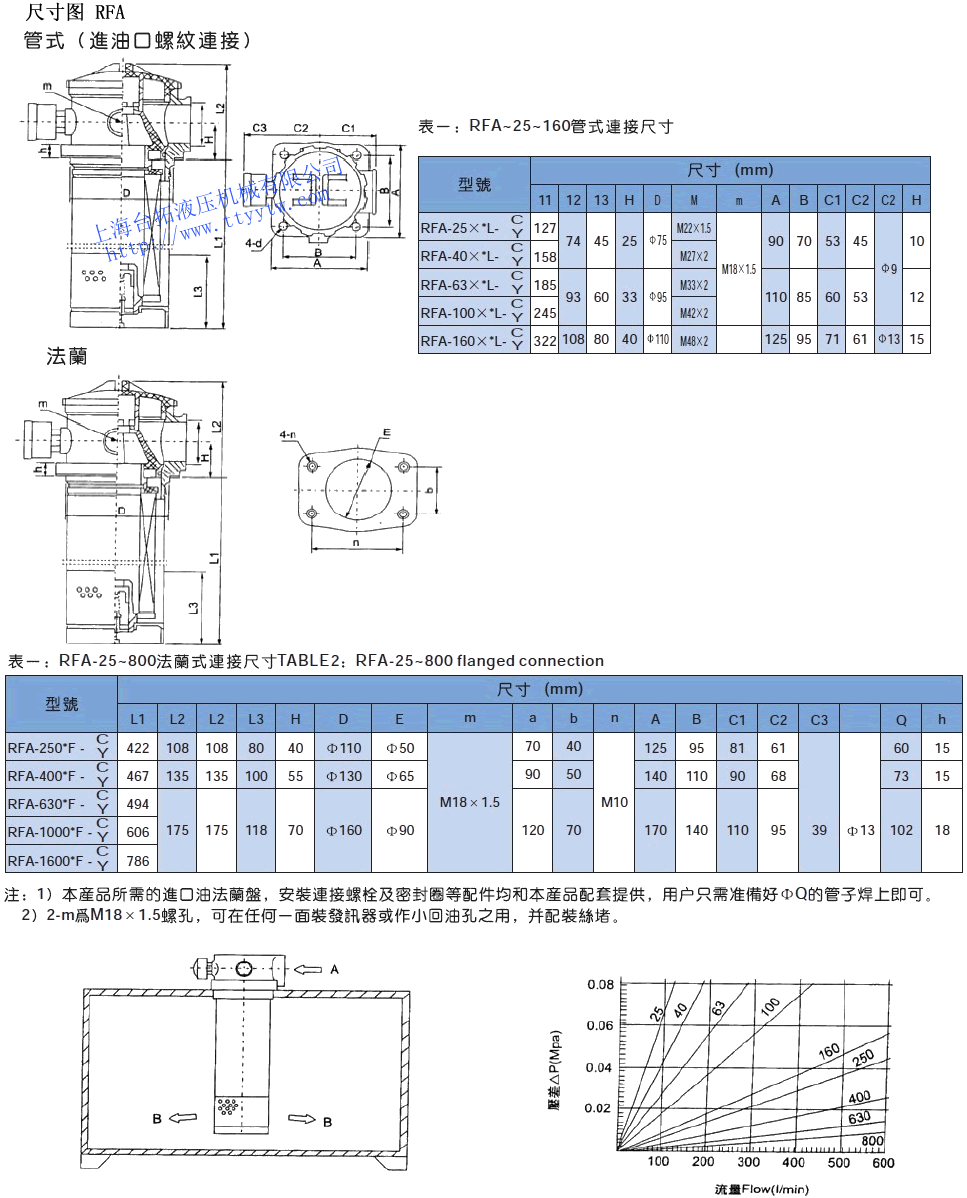 0.250.85 FAX-25×* RFA-25×*L-Y RFA-40×*L-C 40 20 0.9 FAX-40×* RFA-40×*L-Y RFA-63×*L-C 63 25 1.5 FAX-63×* RFA-63×*L-Y RFA-100×*L-C 100 32 1.7 FAX-100×* RFA-100×*L-Y RFA-160×*L-C 160 40 2.7 FAX-160×* RFA-160×*L-Y RFA-250×*L-C 250 50 4.35 FAX-250×* RFA-250×*L-Y RFA-400×*L-C 400 65 6.15 FAX-400×* RFA-400×*L-Y RFA-630×*L-C 630 90 8.2 FAX-630×* RFA-630×*L-Y RFA-800×*L-C 800 90 8.9 FAX-800×* RFA-800×*L-Y RFA-1000×*L-C 1000 90 9.96 FAX-1000×* RFA-1000×*L-Y 備注:*為過濾精度,若使用介質為水乙二醇,帶CYB-發訊器,則過濾器型號為RFA-BH-63×*L-Y濾芯型號為FAX-BH-63X*。