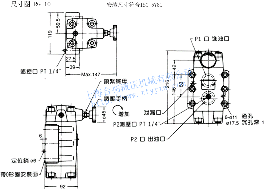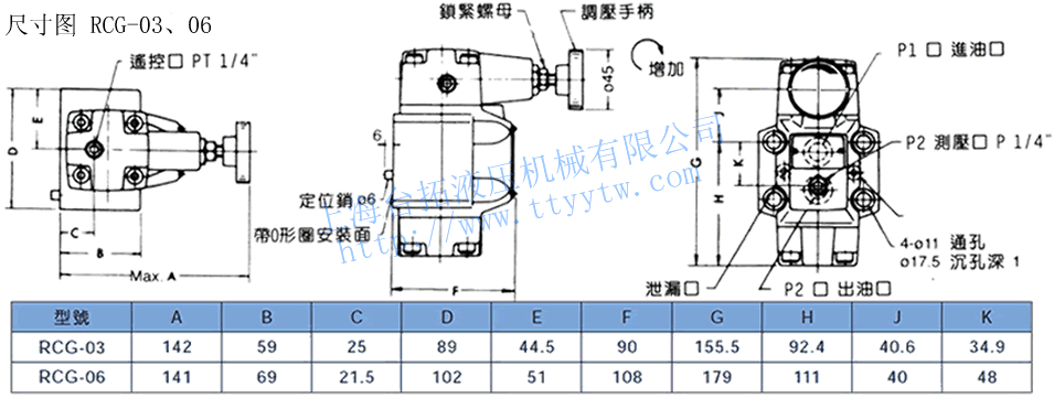 H:7-250.8 4.5 4.3 RCG-03 RCT-03 5.4 4.8 RG-06 RT-06 125 1 6.8 6.9 RCG-06 RCT-06 8.1 7.8 RG-10 RT-10 250 1.2 11.0 12.0 RCG-10 RCT-10 13.8 13.8 備注:1、減壓閥RG,RCG系列泄漏量為前后壓差20.5MPa時所測得的。2、減壓閥RCG、RCT裝有單向閥可使用于執(zhí)行元件的A、B兩孔,而RG、RT只能應(yīng)用于回路中的P孔。3、減壓閥RG,RCG系列調(diào)整調(diào)壓受柄時,升壓須順時針方向慢慢調(diào)整,降壓則相反方向,調(diào)壓后務(wù)必鎖定固定螺帽。4、減壓閥RG,RCG系列泄油口必須在一個接近于大氣壓力的低背壓下直接通油箱。