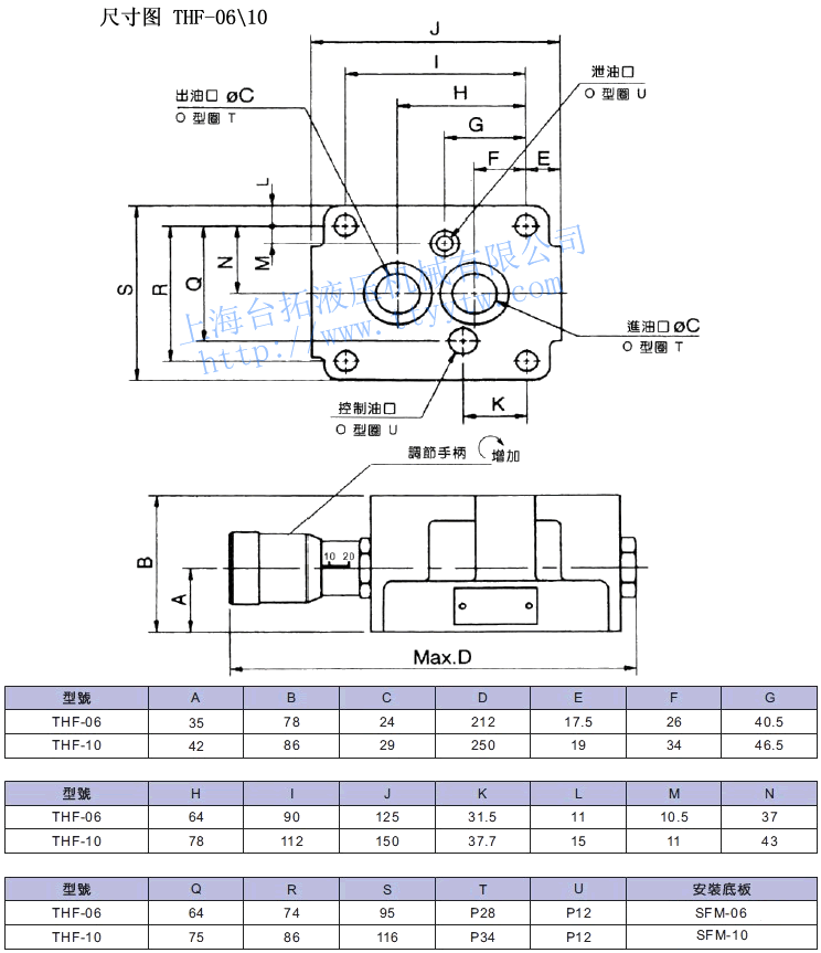型號 最高使用壓力MPa 額定流量?/min 重量Kg 主閥 THF-06 25 120 5.7 THF-10 240 8.7 電磁控制調速閥THF-06,10尺寸圖