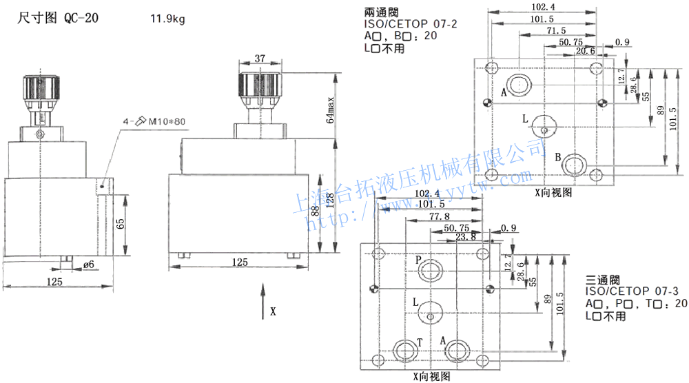 閥型號(hào) QC-10/2 QC-10/2/V QC-10/3 QC-20/2 QC-20/2/V QC-20/3 最大設(shè)定流量(?/min) 60 130 160 180 最小設(shè)定流量(?/min) 120 120 單項(xiàng)閥B→A最大流量(?/min) 80 - - 160 - - 調(diào)節(jié)壓差△P(MPa) ≥0.6 0.6 0.5 ≥0.7 0.8 P口最大流量(?/min) - - 60 - - 180 最大壓力(MPa) 25 25 壓力補(bǔ)償型流量控制閥QC-10,20尺寸圖