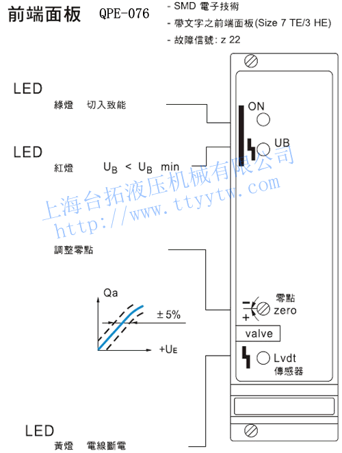 用于快速反應時間之緊急充電及放電 防止短路輸出標示校正 零點經修正電位計±5% LED燈顯示 綠:切入致能 黃:開放回路回授信號 紅:電壓不足(Ub太低) 故障指示:-電線斷電回授信號 -UB太低 -±15V穩定性 z 22:每當+Uk時,打開收集器 最高100mA;無故障:+Uk 警告:連接電源零點b 2和控制零點b 12,b 14或z 28需單獨接地(中心點) 比例閥控制器-印刷電路板QPE-076前端面板
