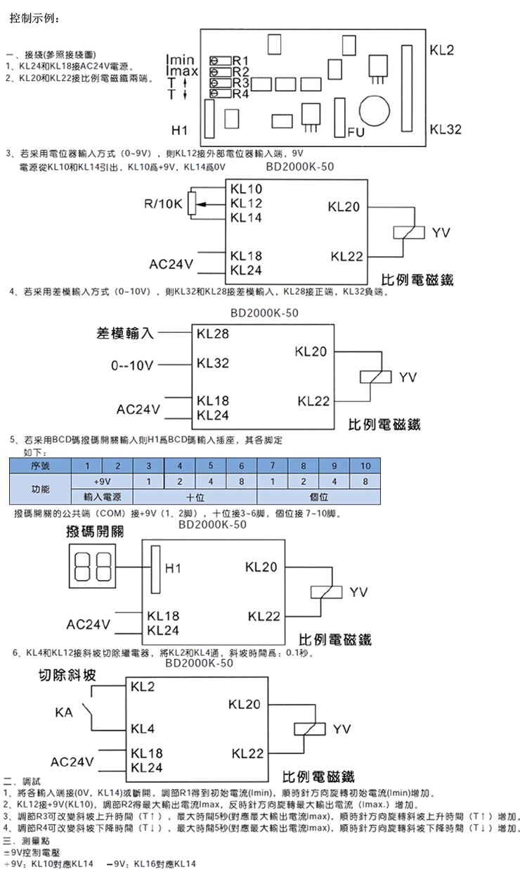 BD 2000K -50 系列號碼 負載 設(shè)計號碼 比例閥功率放大器 45Ω 50 比例閥功率放大器BD2000K-50控制示例