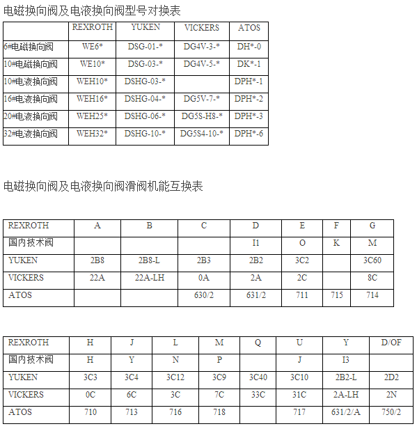 電磁換向閥型號對照表(力士樂、YUKEN、VIKERS、ATOS)