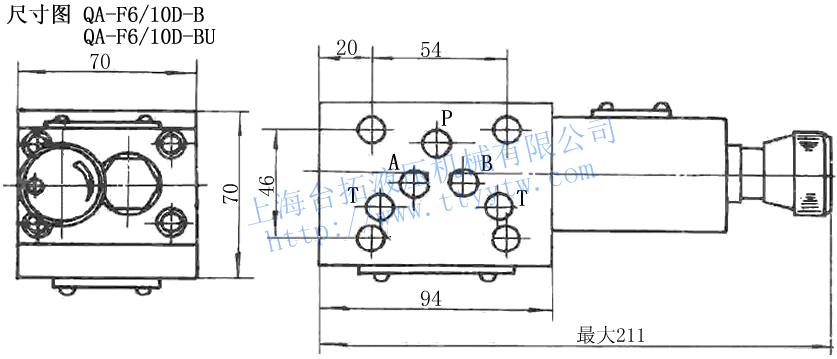 QA -F 6/ 10 D A U 系列號碼 公稱壓力 調整閥通徑 該閥所屬系列 安裝方式 元件進出口油路 出口節流 單向調速閥 20Mpa ?6 ?10 疊加式 A:A出口