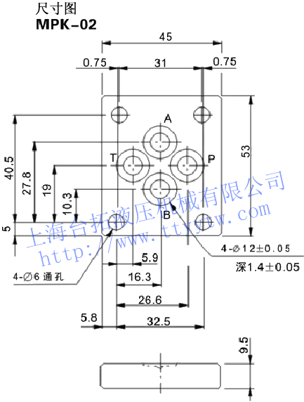 型號 最高使用壓力 Mpa 螺絲 重量 Kg MPK-02 25 M5×16-4支 0.2 MPK-03 M6×20-4支 0.5 疊加閥閥蓋MPK尺寸圖