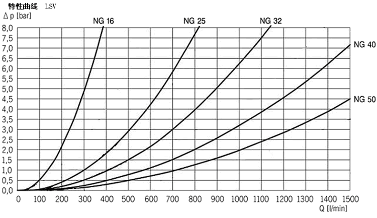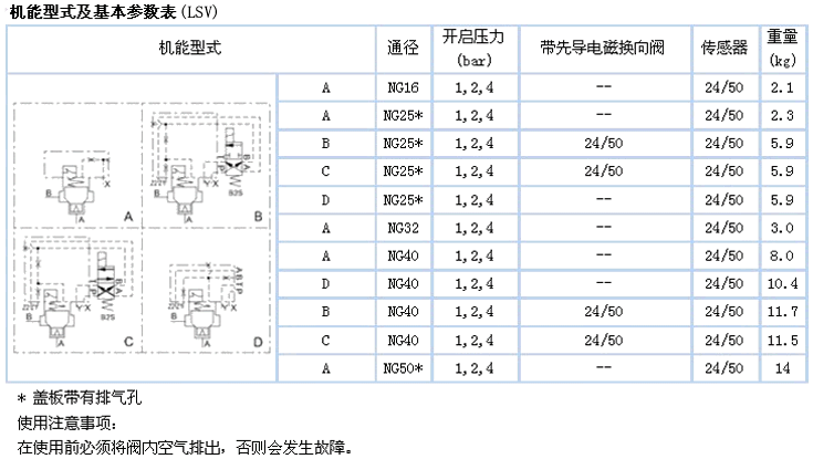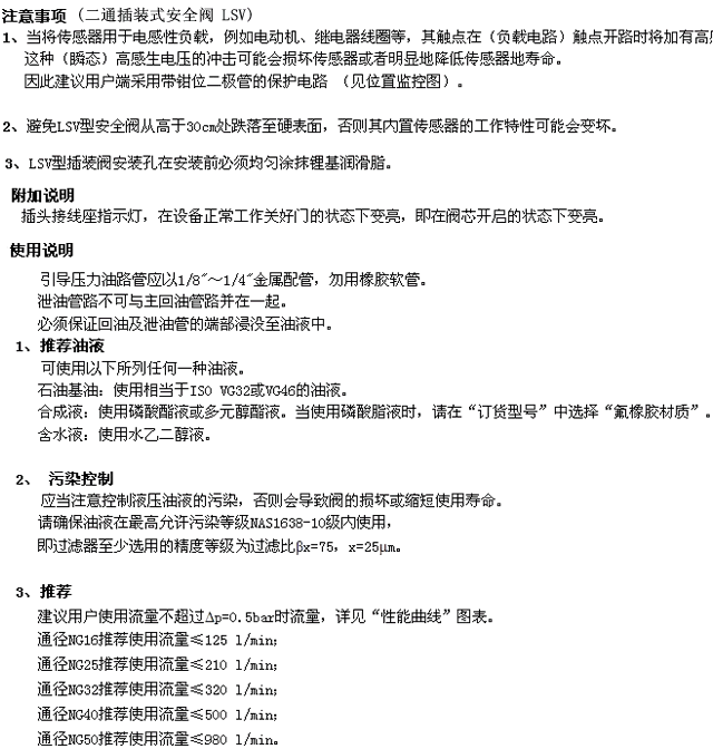 當P=100bar和V=35mm2/s錐閥 與外部電感負載鏈接發光閃耀裝置 發光二級管 防護等級 IP65 DIN40050 暫載率 100%ED 通徑 NG16 NG25 NG32 NG40 NG50 切換頻率 10Hz cm2/s 40 50 75 170 200 安裝位置 插頭面向上或水平裝 二通插裝式安全閥LSV注意事項及使用說明