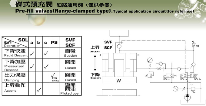 碟式預充閥SVF,SCF體積小易拆裝,低壓損,流量大構造簡單,鋼質本體,可直接裝置于油缸蓋側。
