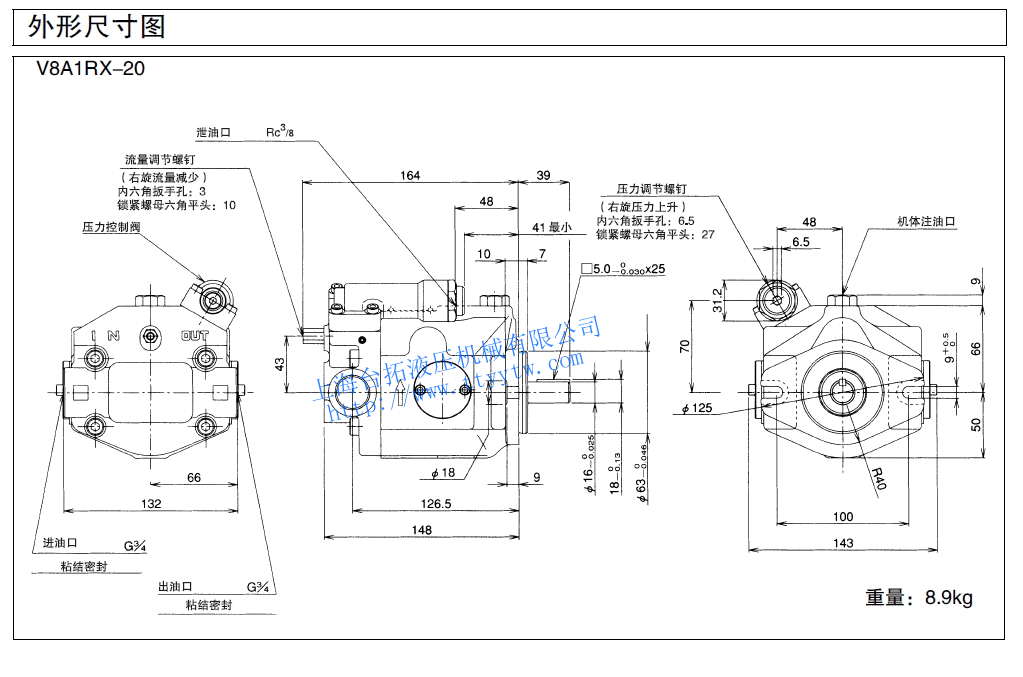 允許轉速Min?1 重量(帶控制A)kg 最大 額定 軸向口 側面口 V8 7 7 8.0 4~14.4 500~1800 - 8.9 V15 21 14 14.8 5.6~26.6 12.8 14.5 V15(Y型) 7 7 14.8 5.6~26.6 13.5 V23 25 17.5 23.0 11~41.4 18.4 21.5 V38 25 17.5 37.7 28~68 24.4 26 V50 21 14 51.6 0~93 - 50 V70 21 14 69.8 20~126 - 55 備注:1、JR-G(T)02和JRP-G02推薦用于遠程控制系統的溢流閥。當泄油口阻塞時,壓力補償機構不能工作,這樣就會變成一種定量泵狀態。2、因油泵不附帶支腳、客戶可根據需求單獨訂購。