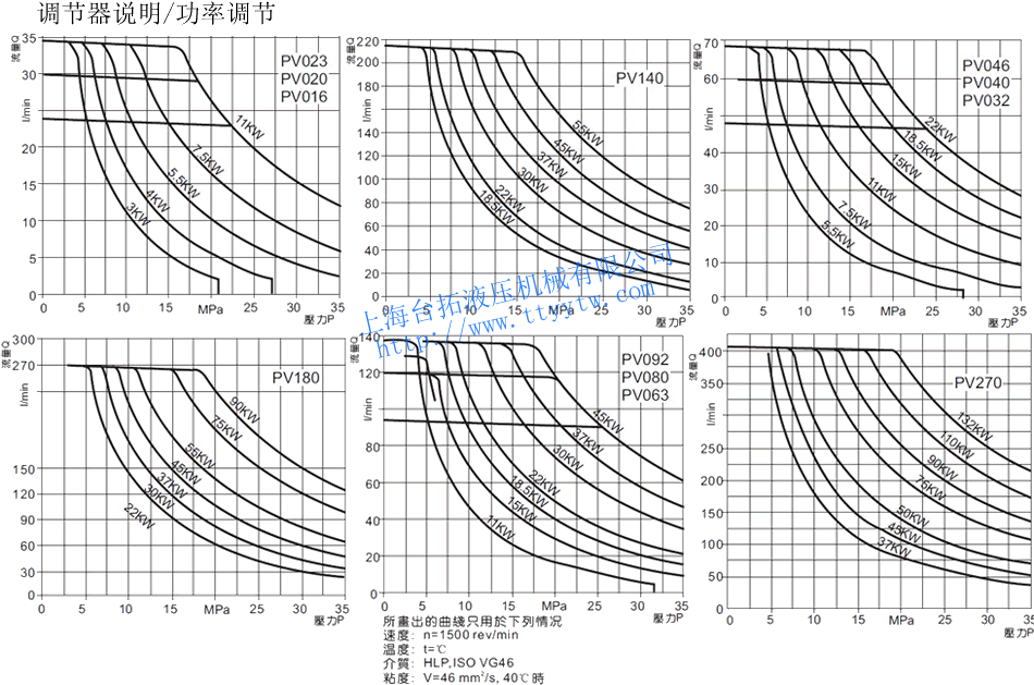 bar吐出量Pump Delivery(7Bar)100PSI 轉速 重量 1200RPM 1500RPM 1800RPM Max Min ml/rev in3/rev LPM U.S.GPM LPM U.S.GPM LPM U.S.GPM RPM RPM KG LB PV016 16 0.98 42 35 19.2 5.1 24 6.3 28.8 7.6 2750 300 19 41.8 PV020 20 1.2 24 6.3 30 7.9 36 9.5 PV023 23 1.4 27.6 7.3 34.5 9.1 41.4 40.9 PV032 32 1.9 38.4 10.1 48 12.7 57.6 15.2 2400 30 66 PV040 40 2.4 48 12.7 60 15.9 72 19 PV046 46 2.8 55.2 14.6 69 18.2 82.8 21.9 PV063 63 3.8 75.6 20 94.5 25 113.4 30 2100 60 132 PV071 71 4.3 85.8 22.7 107 28.3 128.7 34 PV080 80 4.8 96 25.4 120 31.7 144 38 2000 PV092 92 5.6 110.4 29.2 138 63.5 165.6 43.8 1900 PV140 140 8.5 168 44.4 210 55.5 252.1 66.6 2200 90 198 PV180 180 11 216 57.1 70 71.3 324 85.6 PV270 270 16.5 324 85.6 405 107 486 128.4 1800 172 378.4 高壓變量柱塞泵PV016~PV270調節器說明/功率調節